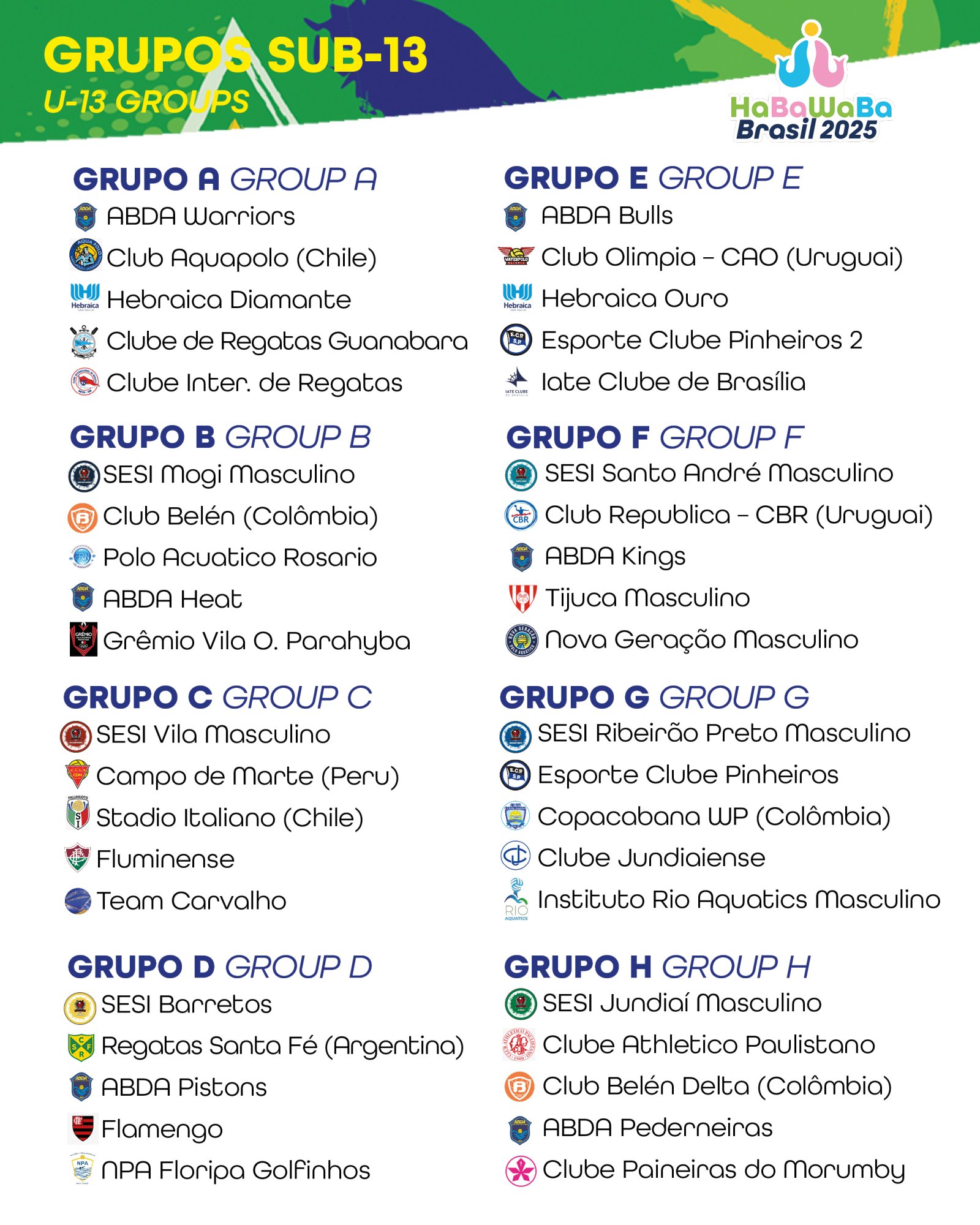 Grupo A: ABDA Warriors, Club Aquapolo (Chile), Hebraica Diamante, Clube de Regatas Guanabara, Clube Internacional de Regatas