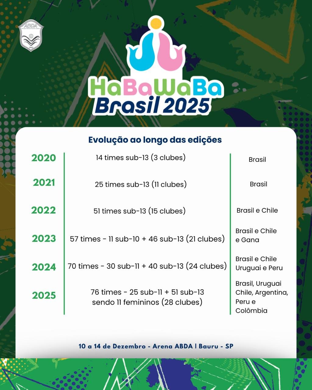 A 6ª edição do HaBaWaBa Brasil já começa a escrever sua história antes mesmo do apito inicial. Com 76 equipes participantes, o evento atinge o maior número desde sua criação, em 2020, e acaba de definir os grupos de disputa nas categorias sub-11 e sub-13. O festival será realizado de 10 a 14 de dezembro, na Arena ABDA, em Bauru (SP), com entrada gratuita para o público.